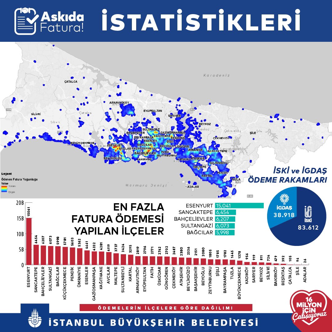 Sosyal medyadan paylaşım yapan İmamoğlu "Hayırsever vatandaşlarımızın askıda ödediği faturaların ilçe ilçe dağılımı, yoksulluk haritamıza uygun bir dağılım gösteriyor. Bu tablo hayırseverlerin desteğinin çok doğru yerlere gittiğini gösteriyor. Bu en güzel hayır işini güçlendirerek sürdürelim" ifadelerini kullandı.