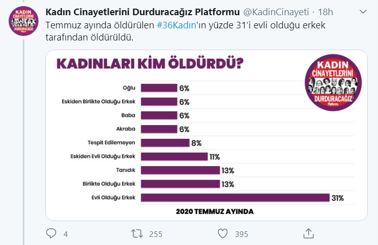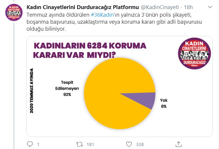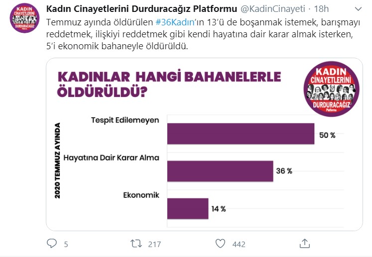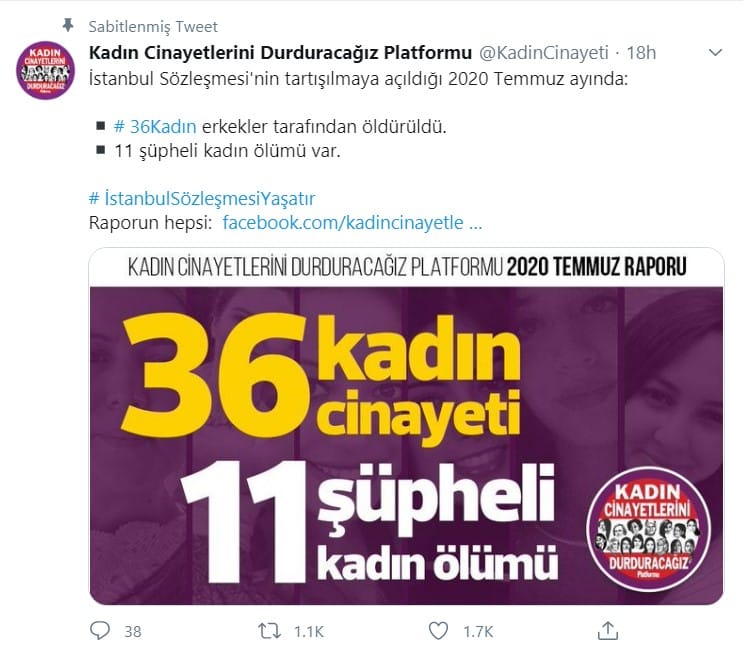 Kadına yönelik şiddeti önleme amacı taşıyan, Türkiye'nin de imzacısı olduğu İstanbul Sözleşmesi ile ilgili tartışmalar sürerken, Kadın Cinayetlerini Durduracağız Platformu'nun açıkladığı rapora göre, Temmuz ayında 36 kadın cinayeti işlendi, 11 kadın şüpheli şekilde ölü bulundu.