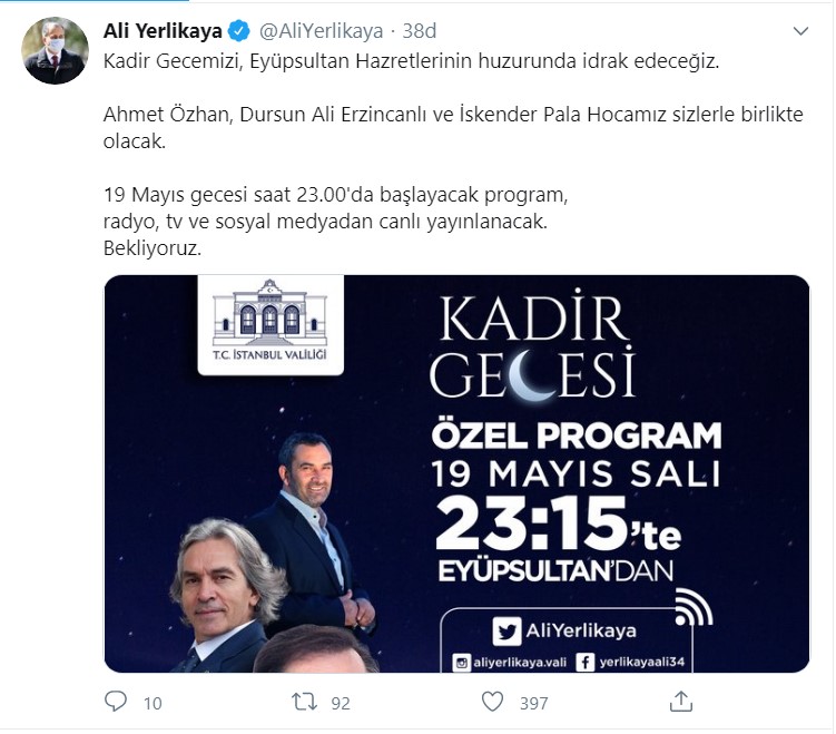 Konuya ilişkin sosyal medya hesabından paylalşım yapan İstanbul Valisi Ali Yerlikaya "Kadir Gecemizi, Eyüpsultan Hazretlerinin huzurunda idrak edeceğiz. Ahmet Özhan, Dursun Ali Erzincanlı ve İskender Pala Hocamız sizlerle birlikte olacak.