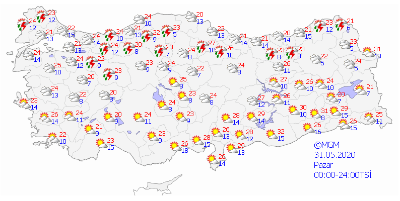 Meteoroloji Genel Müdürlüğü tarafından yapılan son hava durumu değerlendirmelerine göre, ülkenin kuzey, iç ve batı kesimlerinin parçalı ve çok bulutlu, Marmara'nın güney ve batısı, Batı Akdeniz'in iç kesimleri, Doğu Akdeniz'in Toroslar mevkisi, İç Anadolu'nun kuzey ve doğusu, Batı Karadeniz'in iç kesimleri, Orta Karadeniz, Doğu Karadeniz'in iç kesimleri ile Afyonkarahisar, Kütahya, Konya ve Sinop çevrelerinin sağanak ve gök gürültülü sağanak yağışlı, diğer yerlerin az bulutlu ve açık geçeceği tahmin ediliyor.