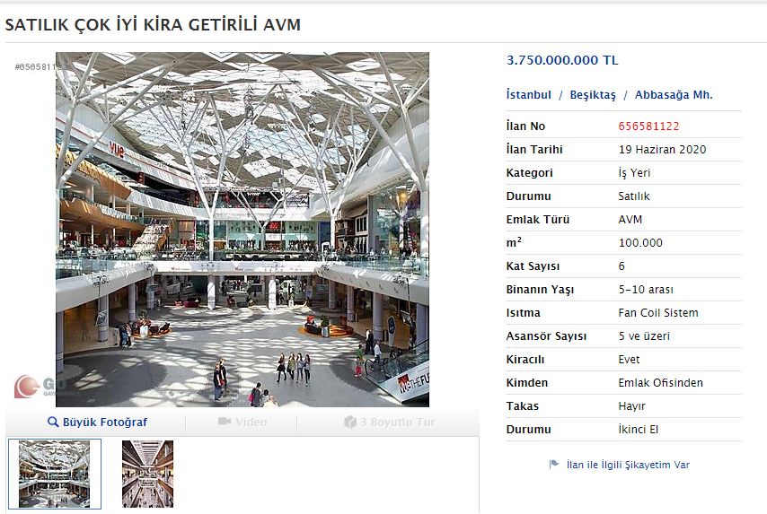Koronavirüs salgını sonrası ziyaretçi sayılarının düşmesiyle birlikte alışveriş merkezleri satışa çıktı. İstanbul'da 6 katlı 100 bin metrekare alana sahip bir AVM, 3 milyar 750 milyon TL'ye, 4 katlı 60 bin metrekarelik başka bir AVM ise 1 milyar 750 milyon TL'ye alıcısını bekliyor. Şişli'de yer alan 6 katlı AVM'nin satış temsilcisi, mal sahibinin gizlilik anlaşması olmadan alışveriş merkezinin yerini bildirmeyeceklerini ifade etti.