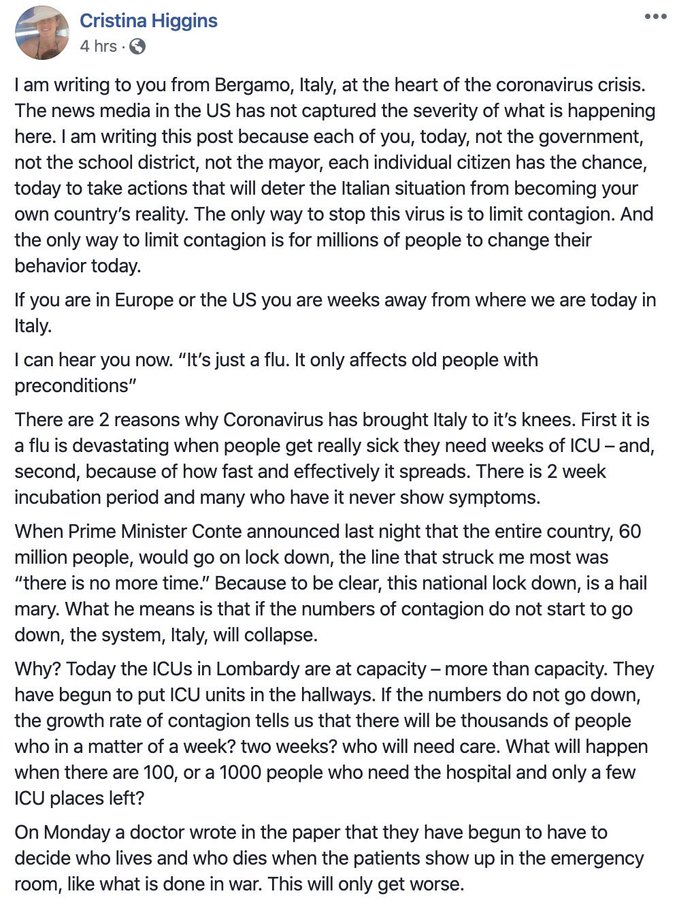 Bu yazıyı yazıyorum çünkü bugün her biriniz; hükümet değil, okullar değil, belediye başkanı değil, her bir vatandaş İtalya gerçeğinin kendi ülkeniz gerçeği olmasını durduracak eylemlerde bulunma şansına sahipsiniz. Bu virüsü durdurmanın tek yolu bulaşmayı sınırlandırmaktır.