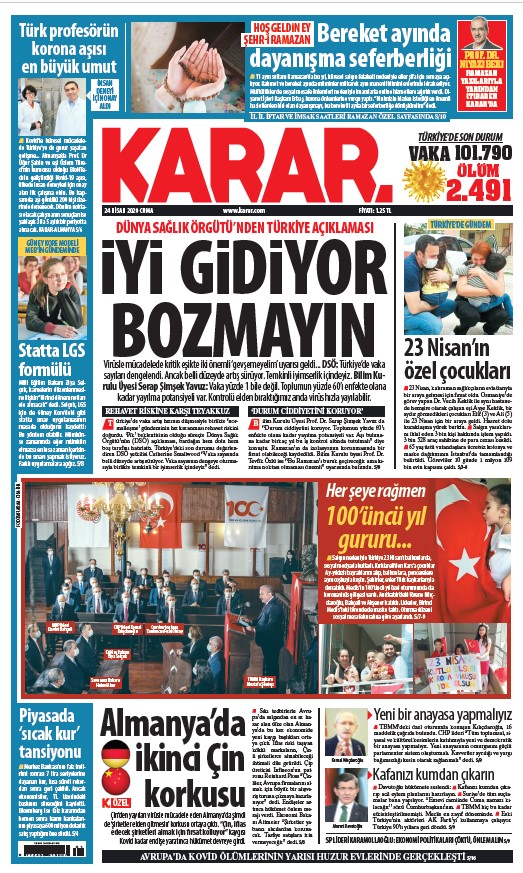 Sağlık Bakanı Fahrettin Koca ise önceki günkü Bilim Kurulu toplantısının ardından olumlu mesajlar vermeyi sürdürdü ancak rehavet uyarısı yaptı. Koca “Yeter ki düşünceli ve bilinçli hareket etmekten taviz vermeyelim. Ulaşacağımız güzel yarınlar bugün alınan tedbirler sayesinde olacaktır. Erken tanı ve tedavideki başarımızla vefat oranlarımız her geçen gün düşüyor. Yoğun bakım hasta sayımız azalıyor. Hazırlıklı olmasaydık, tablo, ABD ve Avrupa’dakine benzeyecekti. Bulunduğumuz nokta toplumun ortak başarısıdır. Daha iyi bir sonucun mümkün olduğunun kanıtıdır” dedi. Ramazan Ayı’na dikkat çeken Koca “Ramazanın özelliği, insana alışkanlıklarının dışına çıkma gücü vermesidir. Ramazan, tedbirleri esnetmenin bahanesi olmamalı. Kalabalık iftarları, sohbetleri gelecek yıla erteleyelim. Rahmet ayı, hastalıklarla sonuçlanmasın. Hayatın kademeli şekilde normalleşmesi, kuralların uygulanmasıyla mümkündür. Hastalık, öngördüğümüz şekilde seyrediyor. Bilinçli olursak, normalleşme gecikmeyecektir. Umut, en doğru kelime. Fakat bu umut tedbirsizlikle tehdide dönüşmemeli” değerlendirmelerin bulundu. Bilim Kurulu üyesi Prof. Dr. Tevfik Özlü de Ramazan uyarısı yaptı. Özlü “Bu Ramazan ezberleri bozmamız gerekiyor. Bu ayı nasıl geçireceğimiz çok önemli. Ramazan kırılma noktası olmamalı” diye konuştu.