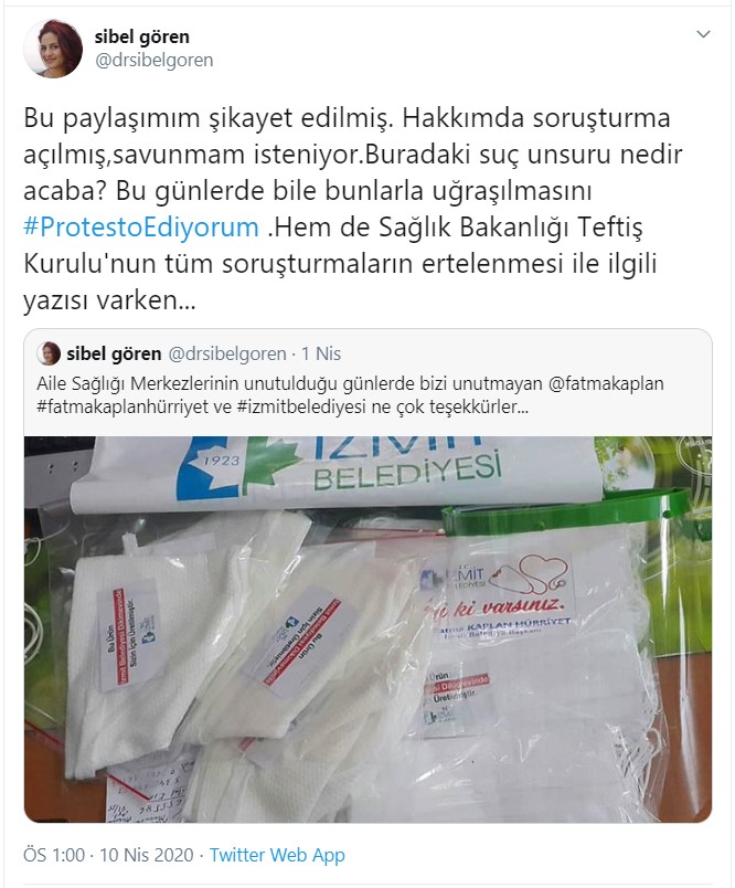 "Bu paylaşımım şikâyet edilmiş. Hakkımda soruşturma açılmış, savunmam isteniyor. Buradaki suç unsuru nedir acaba? Bu günlerde bile bunlarla uğraşılmasını protesto ediyorum. Hem de Sağlık Bakanlığı Teftiş Kurulu’nun tüm soruşturmaların ertelenmesi ile ilgili yazısı varken…"