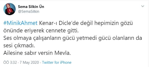 Gelecek Partisi Genel Başkan Yardımcısı Sema Silkin Ün: #MinikAhmet Kenar-ı Dicle’de değil hepimizin gözü önünde eriyerek cennete gitti. Ses olmaya çalışanların gücü yetmedi gücü olanların da sesi çıkmadı. Ailesine sabır versin Mevla.