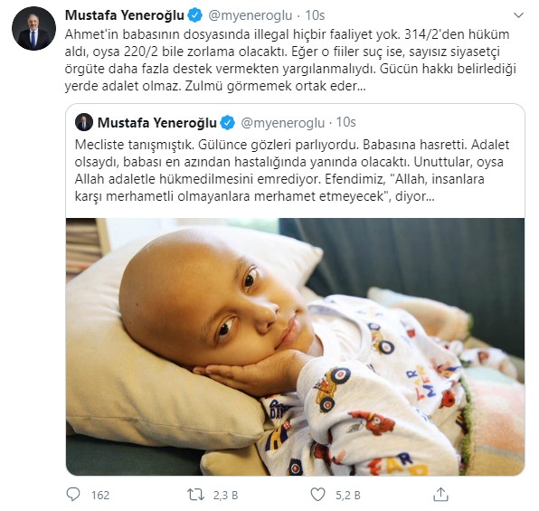 DEVA Partisi İstanbul Milletvekili Mustafa Yeneroğlu: Mecliste tanışmıştık. Gülünce gözleri parlıyordu. Babasına hasretti. Adalet olsaydı, babası en azından hastalığında yanında olacaktı. Unuttular, oysa Allah adaletle hükmedilmesini emrediyor. Efendimiz, "Allah, insanlara karşı merhametli olmayanlara merhamet etmeyecek", diyor... Ahmet'in babasının dosyasında illegal hiçbir faaliyet yok. 314/2'den hüküm aldı, oysa 220/2 bile zorlama olacaktı. Eğer o fiiler suç ise, sayısız siyasetçi örgüte daha fazla destek vermekten yargılanmalıydı. Gücün hakkı belirlediği yerde adalet olmaz. Zulmü görmemek ortak eder... Sayısız insana bu mağduriyeti yaşatan sadece devletin hukuksuzluğu değil,aynı zamanda birçok illegaliteyi sözde hayır işleri ile örtüp iyi niyetli insanları iktidar hırslarına araçsallaştıran zalimler ve onların mahrem yapısı.Şu anda da tek yaptıkları, mağduriyetlerden medet ummak.