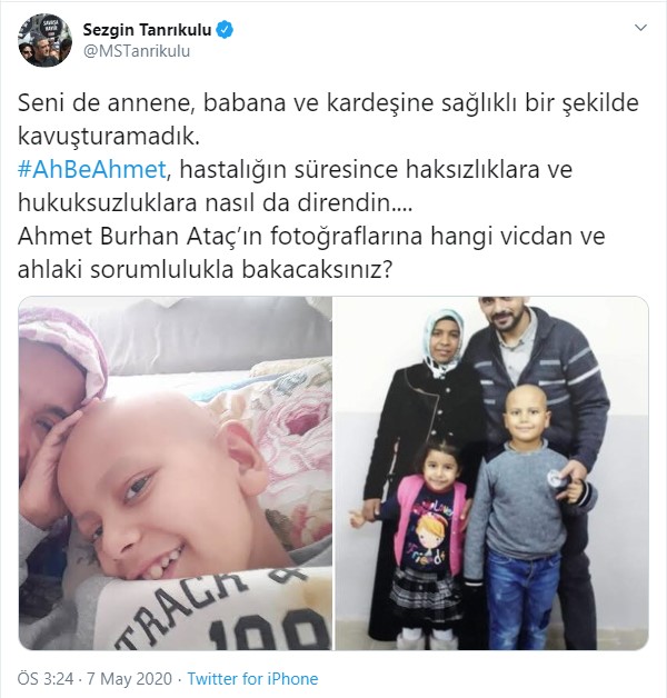 CHP İstanbul Milletvekili sezgin Tanrıkulu: Seni de annene, babana ve kardeşine sağlıklı bir şekilde kavuşturamadık. #AhBeAhmet, hastalığın süresince haksızlıklara ve hukuksuzluklara nasıl da direndin.... Ahmet Burhan Ataç’ın fotoğraflarına hangi vicdan ve ahlaki sorumlulukla bakacaksınız?