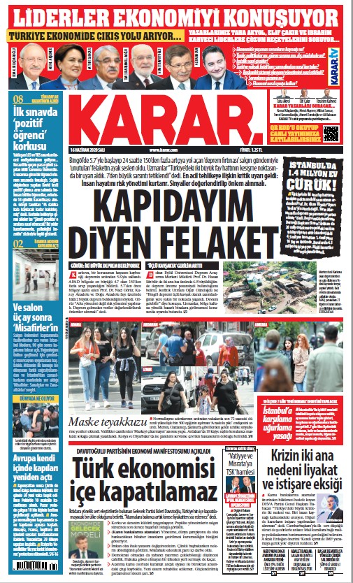 Bingöl’de meydana gelen deprem için aylar önce uyarıda bulunan Prof. Dr. Naci Görür “Biz Karlıova’da deprem bekliyorduk. Kuzey Anadolu Fayı üzerinde, Erzincan ile Karlıova arasında oldu. 46’dan fazla artçı deprem oldu. Bunun birinci sonucu olarak da Erzincan-Karlıova Yedisu Fay Hattı’nda beklediğimiz depremin öne çekildiğini söylemem gerekir. Ben, alarm veriyorum ve bu noktada, 7 büyüklüğünde bir deprem olabilir uyarısında bulunuyorum. Nasıl İstanbul Silivri’de, meydana gelen 5.8’lik deprem İstanbul depremini öne çektiyse; Karlıova’daki 5.7’lik depremde böyle değerlendirilmeli. Bu deprem, küçük-orta olmakla birlikte önemi ve verdiği mesaj büyüktür” dedi. Görür, İstanbul için risk oranının ise yüzde 62 olduğuna dikkat çekti. Yetkililerin uyarılarını dinlemediğinin altını çizen Görür “Afet yönetiminden önce risk yönetimi yapılmalı” dedi.
