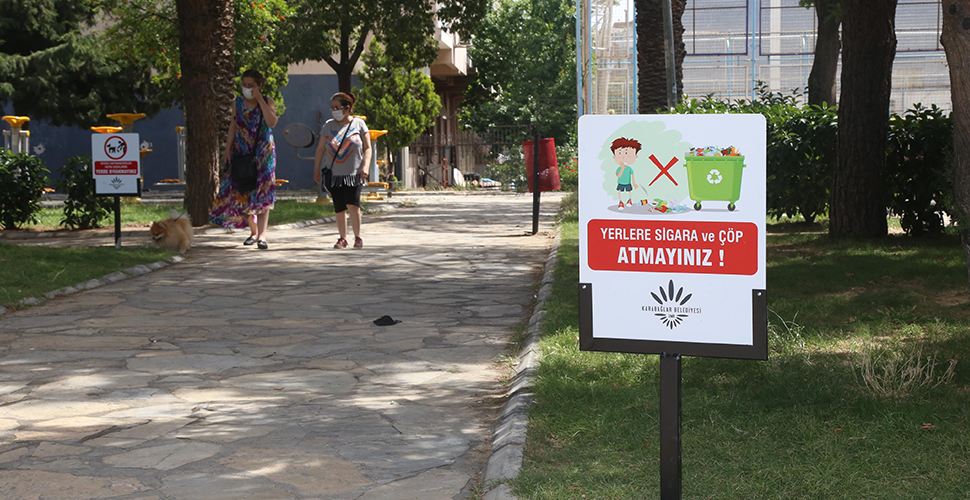 İzmir'de Karabağlar Belediye ekipleri, parklardaki oyun alanlarının önüne “Bu alanda sigara içmeyerek bizi düşündüğünüz için teşekkür ederiz”, yürüyüş alanlarına ve bankların yakın noktalarına “Yerlere sigara ve çöp atmayınız” , açık alanlara “Mangal ve ateş yakmak yasaktır”, çimlerin bulunduğu noktalara “Sevgili hayvanseverler köpek dışkılarını yerde bırakmayınız”, tahta köprülerin bulunduğu parklarda “Motosiklet ile girmek yasaktır” ve su havuzlarının bulunduğu noktalara da “Havuza girmek tehlikeli ve yasaktır” yazılı levhalar yerleştiriyor.