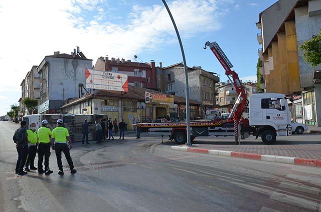 Çarpışmanın etkisiyle devrilen midibüsün sürücüsü ile araçtaki 10 kişi yaralandı.