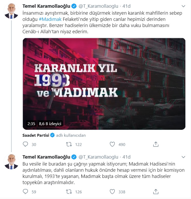 Vidoyu paylaşan Karamollaoğlu, şu ifadeleri kullandı: "İnsanımızı ayrıştırmak, birbirine düşürmek isteyen karanlık mahfillerin sebep olduğu #Madımak Felaketi'nde yitip giden canlar hepimizi derinden yaralamıştır. Benzer hadiselerin ülkemizde bir daha vuku bulmamasını Cenâb-ı Allah’tan niyaz ederim."
