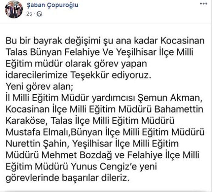 İlçe Milli Eğitim Müdürlüklerine ataması yapılan yeni isimleri sosyal medya hesabından duyuran AK Parti Kayseri İl Başkanı Şaban Çopuroğlu, şu notu paylaştı;
