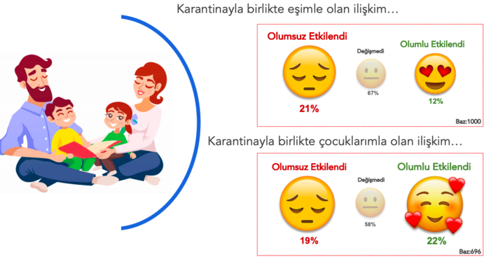Araştırmada, karantinayla birlikte eşlerle ve çocuklarla olan ilişkilerin nasıl değiştiği ve evlerde vakit geçirmek için hangi aktivitelerin yapıldığı da incelendi.