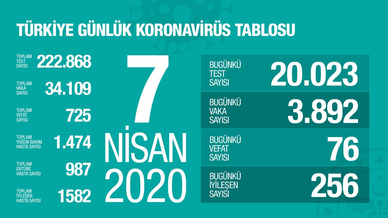 Türkiye’de bugüne kadar yapılan test sayısı 222 bin 868’e ulaşırken, toplamda 34 bin 109 vaka tespit edildi. Bin 582 hastalığı yenerek sağlığına kavuştu, toplamda 725 hasta koronavirüs nedeniyle yaşamını yitirdi.