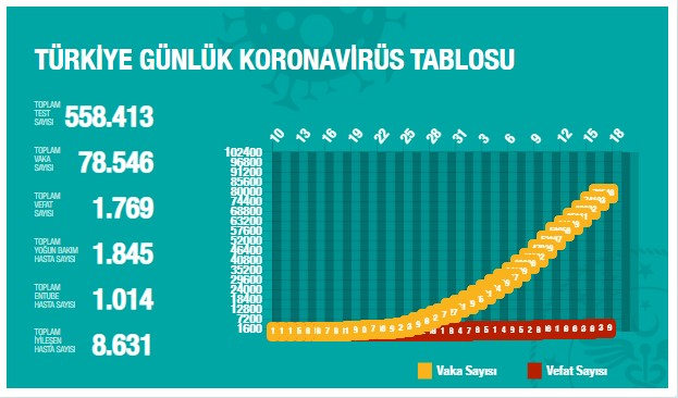 Sağlık Bakanı Fahrettin Koca, Türkiye'de yeni tip koronavirüs (Kovid-19) vaka sayısının bugün eklenen 4 bin 353 kişiyle 78 bin 546'ya ulaştığını, 1542 hastanın iyileştiğini, toplamda 8 bin 631 kişinin hastalığı yendiğini bildirdi.