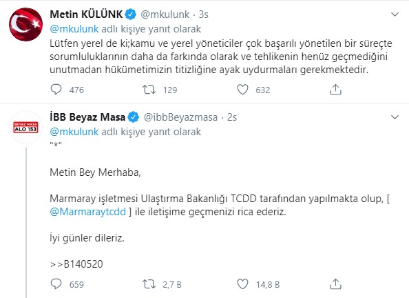 “Metin Bey Merhaba, Marmaray işletmesi Ulaştırma Bakanlığı TCDD tarafından yapılmakta olup, [@Marmaraytcdd] ile iletişime geçmenizi rica ederiz. İyi günler dileriz.”