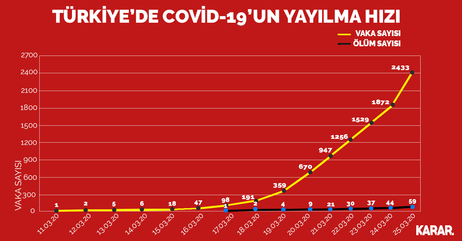 Sağlık Bakanı Fahrettin Koca, Türkiye'de koronavirüs (Kovid-19) salgını nedeniyle ölenlerin sayısının 59'a, toplam vaka sayısının ise 2 bin 433'e yükseldiğini açıklamıştı.