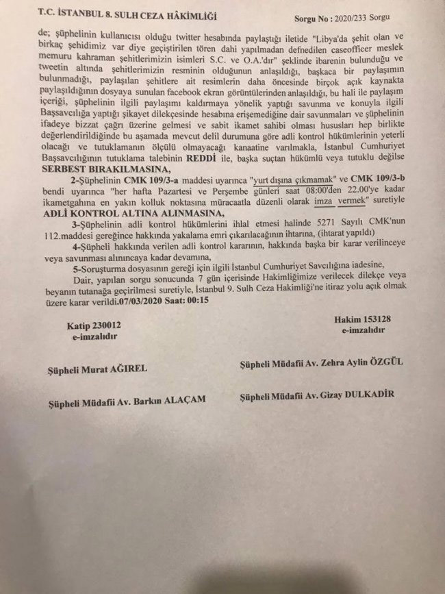 Ağırel, savcılığın kararıyla tutuklama istemiyle sevk edildiği İstanbul 8. Sulh Ceza Hâkimliği, Ağırel'in tutuksuz yargılanması için adli kontrol şartıyla serbest bırakılmasına karar vermişti. Mahkeme, verilen kararda Ağırel'in yaptığı paylaşımların daha evvel farklı hesaplardan da yapıldığı kaydedilerek, mevcut delil durumuna göre adli kontrol şartıyla serbest bırakılmasına karar vermişti.