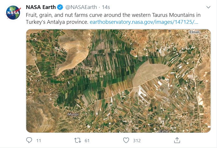 'NASA Earth' isimli Twitter hesabından yapılan paylaşımda, "Türkiye'nin Antalya ilinde Batı Toros Dağları çevresinde meyve, tahıl ve kabuklu yemiş çiftlikleri." notuna yer verildi.