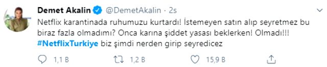 Sosyal medya kullanıcıları ister istemez bu mesaja inanırken, ünlü şarkıcı Demet Akalın da bir paylaşımda bulunarak, karara isyan etti. Akalın, "Netflix karantinada ruhumuzu kurtardı! İstemeyen satın alıp seyretmez bu biraz fazla olmadı mı? Onca kadına şiddet yasası beklerken! Olmadı!!! #NetflixTürkiye biz şimdi nereden girip seyredeceğiz" diye yazdı. Görsel fotomontaj olduğunu öğrenen Akalın, paylaşımını sildi.
