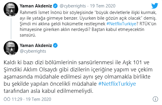 Siber haklar aktivisti ve akademisyen Yaman Akdeniz ise Netflix'i eleştirdi. "Şimdi mi aklına geldi hükümetle restleşmek? RTÜK'ün himayesine girerken aklın neredeydi? Baştan kabul etmeyecektin sansürü" diyen Akdeniz, şirketin 'Aşk101' dizisine yapılan sansüre karşı çıkması gerektiğini savundu.