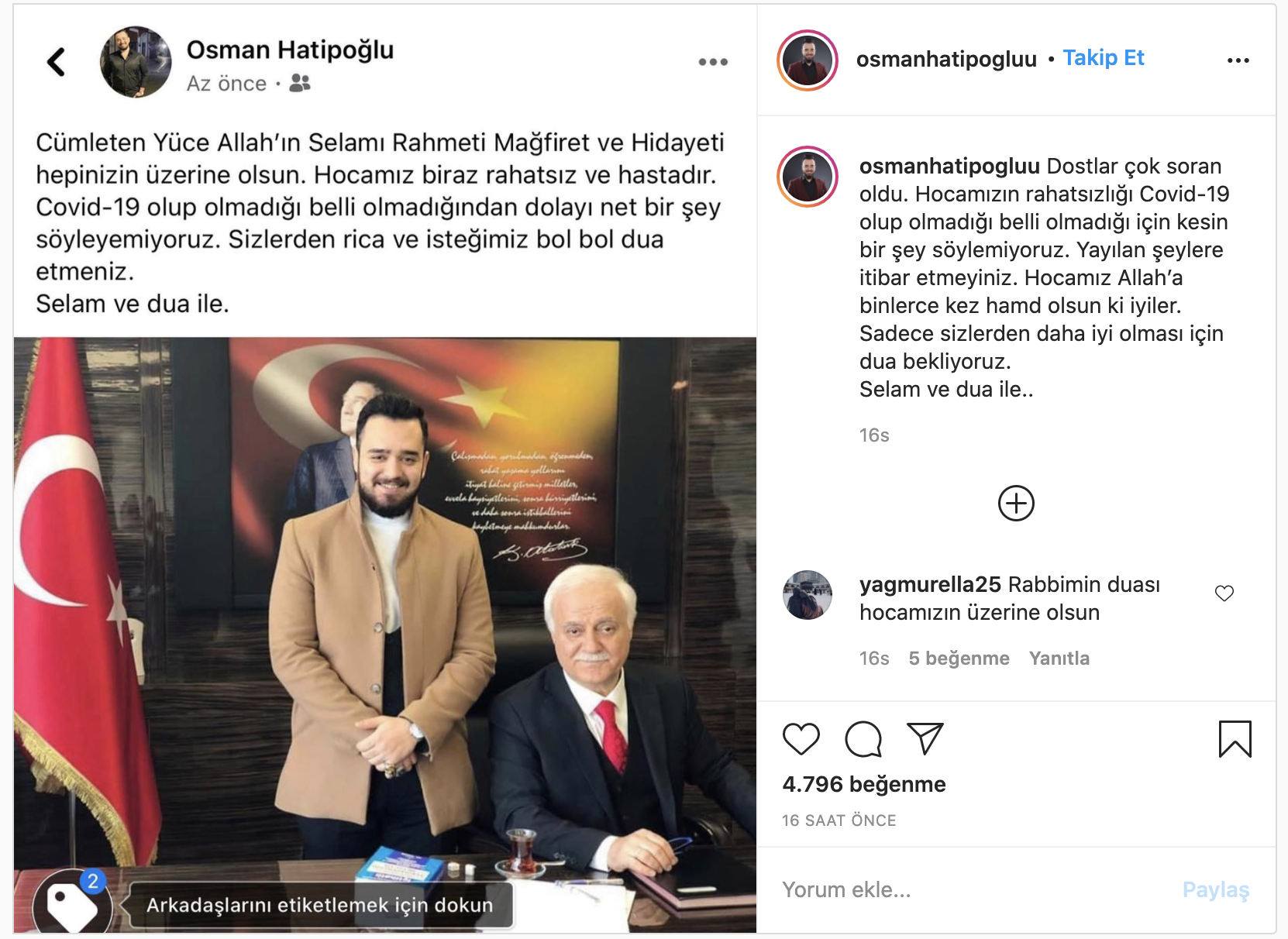 Nihat Hatipoğlu'nun oğlu Osman Hatipoğlu, resmî Instagram hesabı üzerinden yaptığı açıklamada, babasının Kovid-19 olduğuna dair net bir bilgi olmadığını ancak yayılan yalan haberlere itibar etmemeleri gerektiğini vurguladı. Hatipoğlu'nun sağlık durumunun iyi olduğunu söyleyen oğul Hatipoğlu, dua beklediklerini ifade etti.