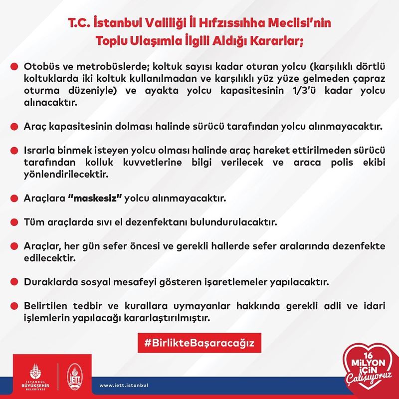 Sağlık Bakanlığı Koronavirüs Bilim Kurulu’nun Tavsiye Kararı ile Bakanlık tarafından 81 il valiliğine gönderilen Covid-19 Tedbirleri konulu ek genelge kapsamında, illerdeki toplu taşıma kuralları İl Umumi Hıfzıssıhha Meclislerine bırakılmıştı. İstanbul İl Umumi Hıfzıssıhha Meclisi de İstanbul'daki toplu taşıma kurallarını duyurdu.