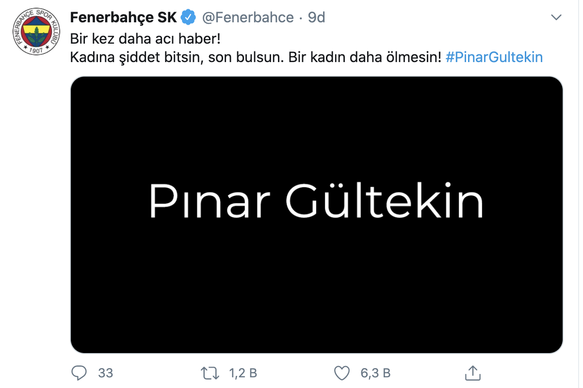 Sosyal medya platformu Twitter'da da Pınar Gültekin olayı büyük yankı uyandırdı. Twitter'da ''#pinargultekin'' etiketi gündemde en üst sıraya yerleşirken, İstanbul Büyükşehir Belediye Başkanı Ekrem İmamoğlu da dâhil olmak üzere birçok çok ünlü isim, kurum ve kuruluşun yanı sıra Twitter kullanıcıları da Pınar Gültekin ile ilgili tweet attı.