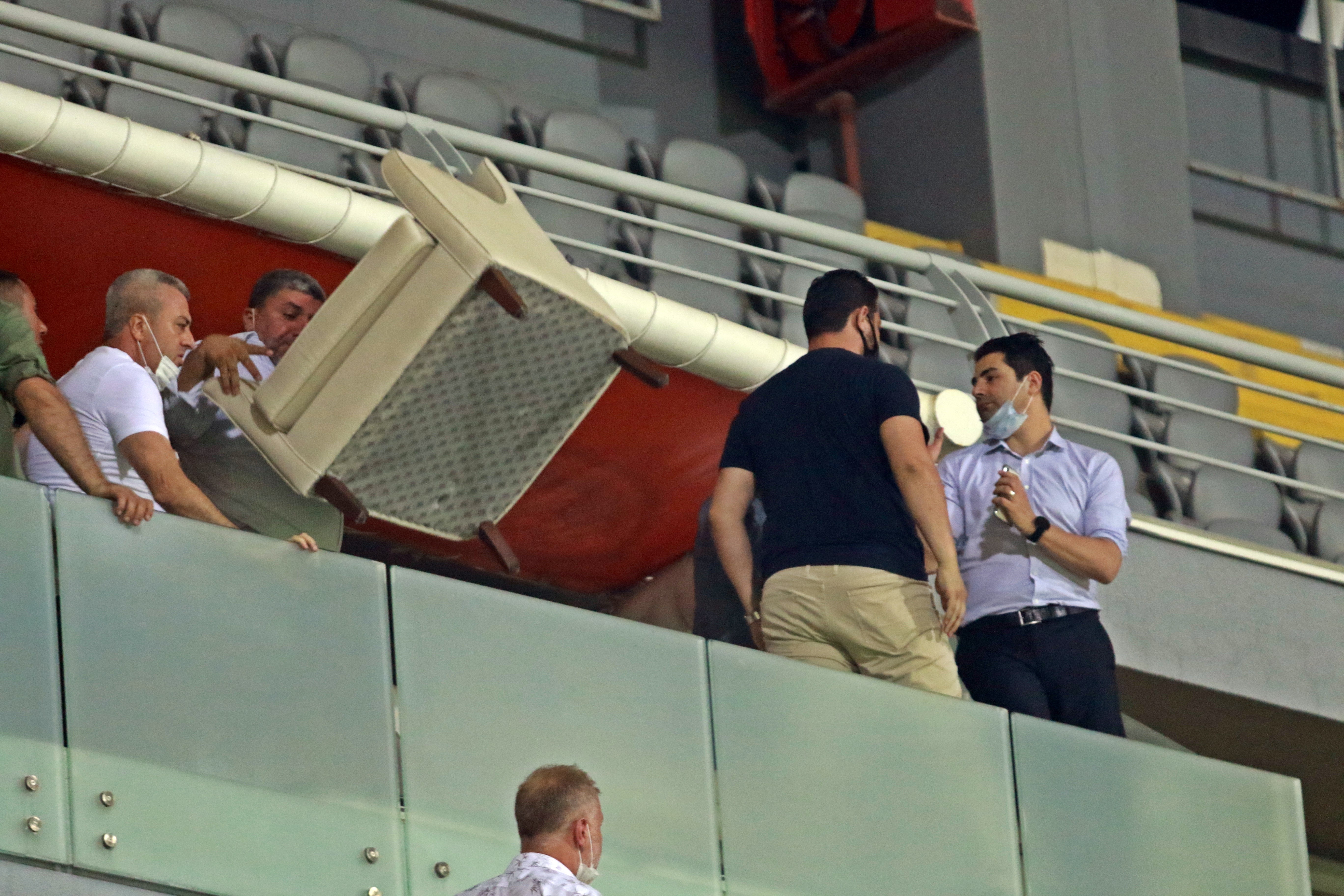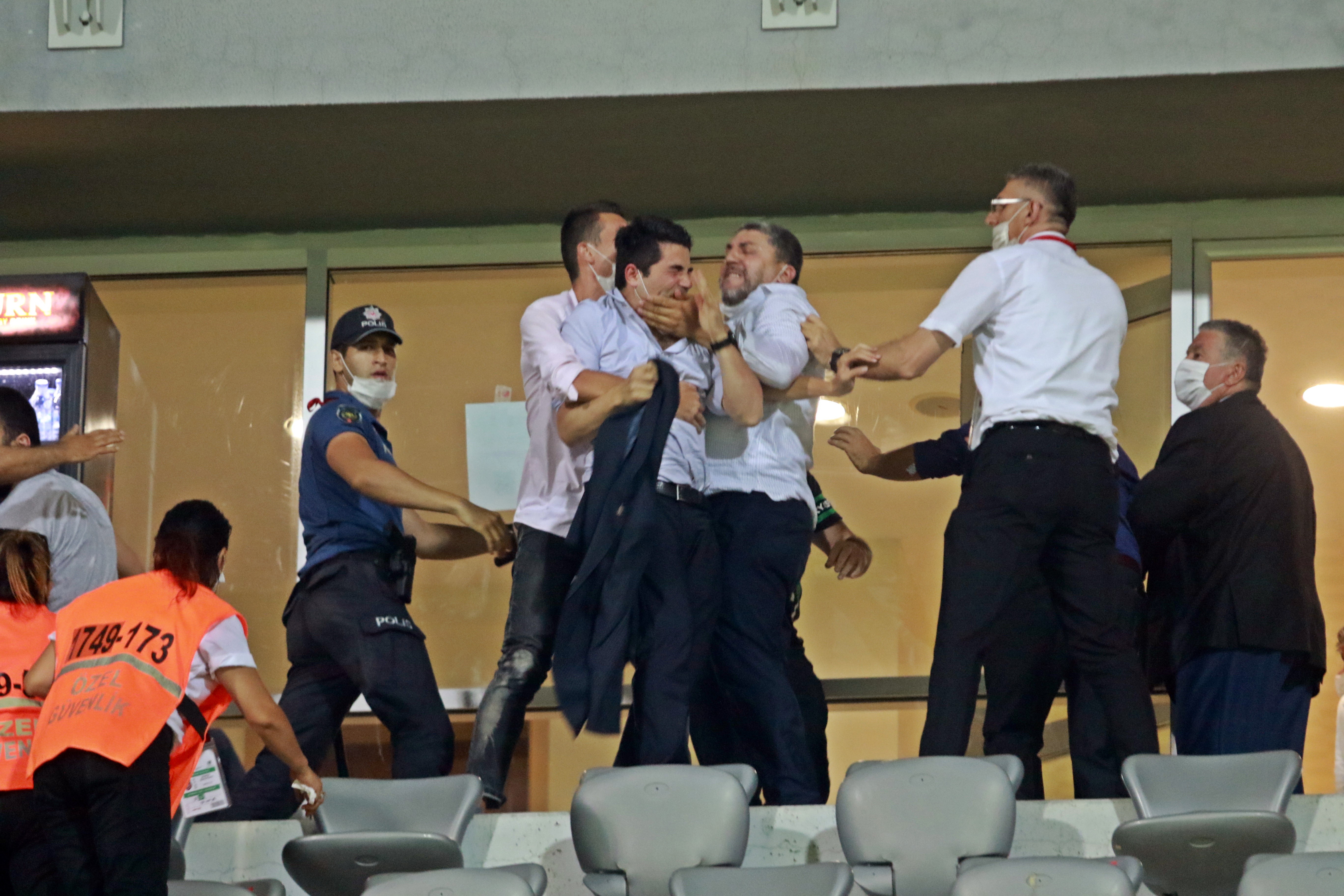 Aralarında yöneticilerin de bulunduğu Sakaryaspor kafilesi ile Ankara Demirspor cephesi arasındaki tartışma bir anda büyüyerek kavgaya dönüştü. Protokol tribününden koltuklar aşağıya fırlatıldı.