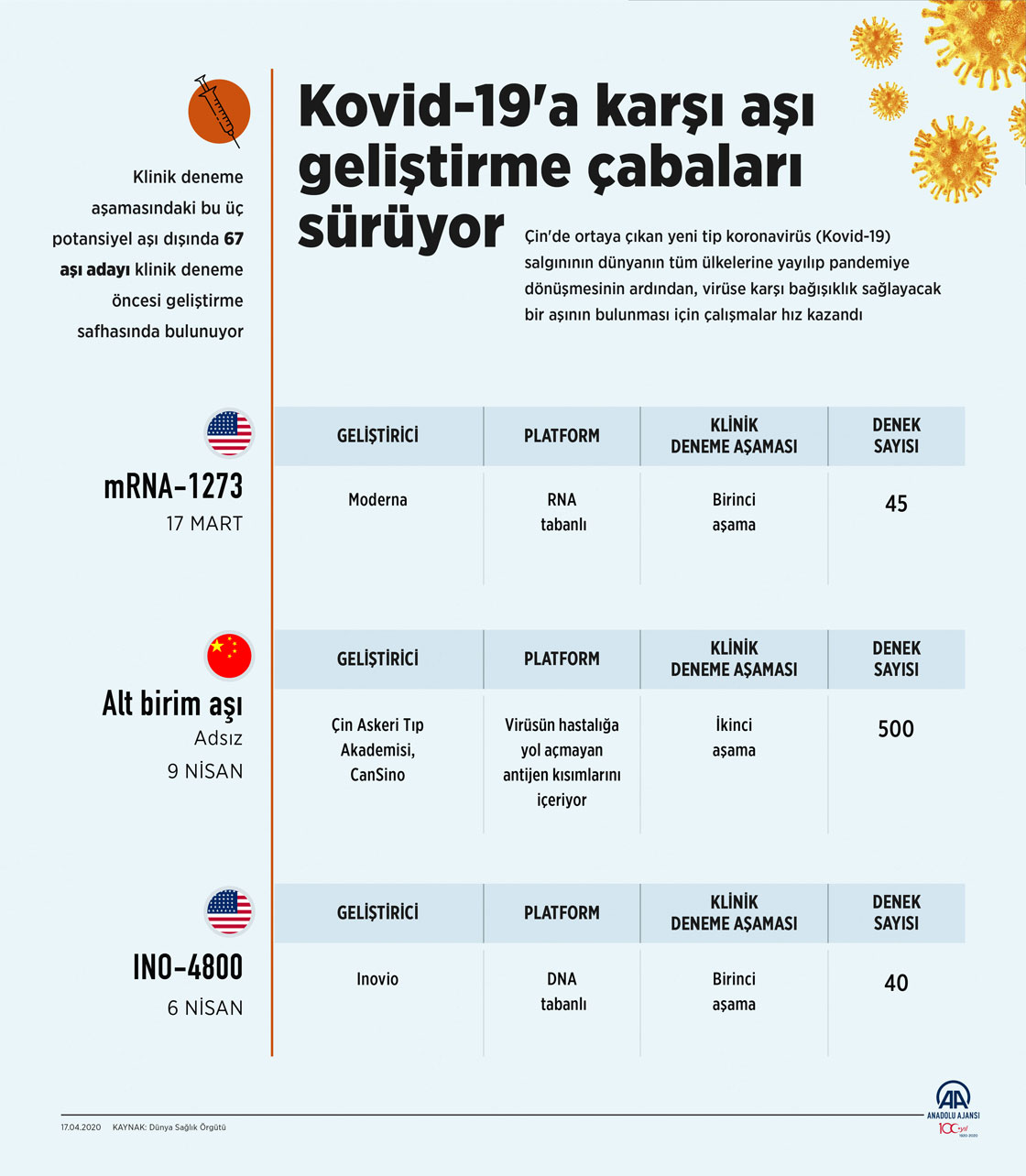 Çin'de ortaya çıkan yeni tip koronavirüs salgınının dünyanın tüm ülkelerine yayılıp pandemiye dönüşmesinin ardından, virüse karşı bağışıklık saylayacak bir aşının bulunması için çalışmalar hız kazandı.