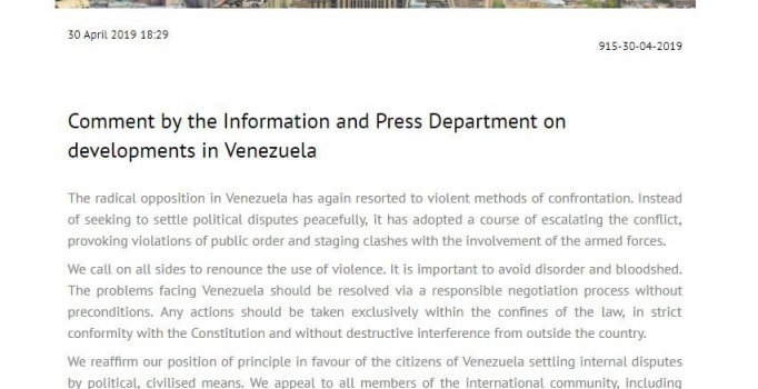 Rusya Dışişleri Bakanlığı yaptığı yazılı açıklamada, Venezuela’daki radikal muhalefetin yeniden çatışma yöntemine başvurduğunu belirtilerek, “Şiddetten vazgeçme çağrısı yapıyoruz. Kan dökülmesinden ve düzensizlikten kaçınmak önemlidir” ifadelerini kullandı.