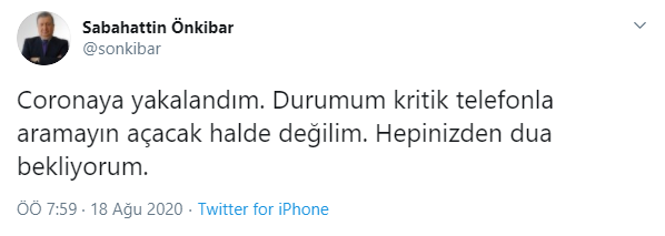 Aralık 2019'da Çin'in Vuhan kentinde ortaya çıkan ve Türkiye'de de etkisini sürdüren corona virüsü salgın hastalığı yayılmaya devam ediyor. Gazeteci Sabahattin Önkibar da kendisine virüs bulaştığını duyurdu. Twitter hesabından açıklama yapan tecrübeli gazeteci şunları yazdı "Koronaya yakalandım. Durumum kritik telefonla aramayın açacak halde değilim. Hepinizden dua bekliyorum."