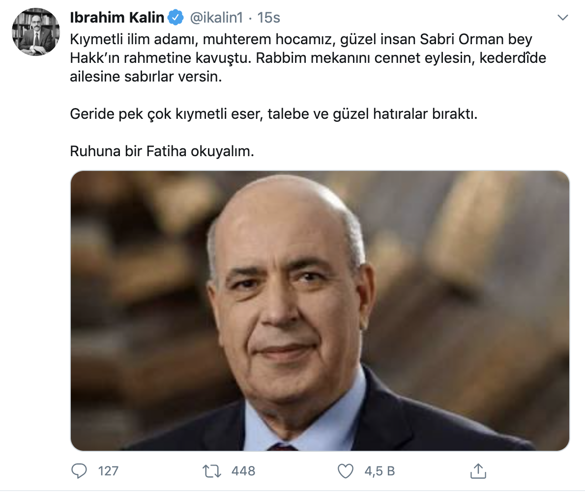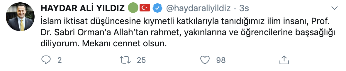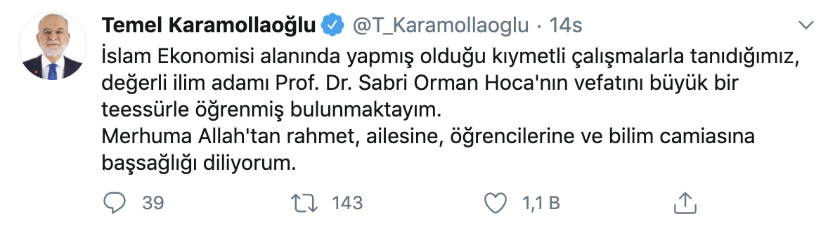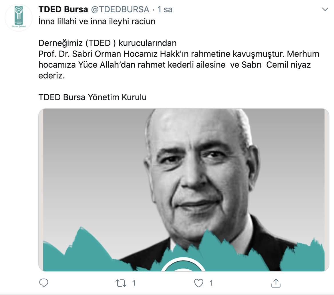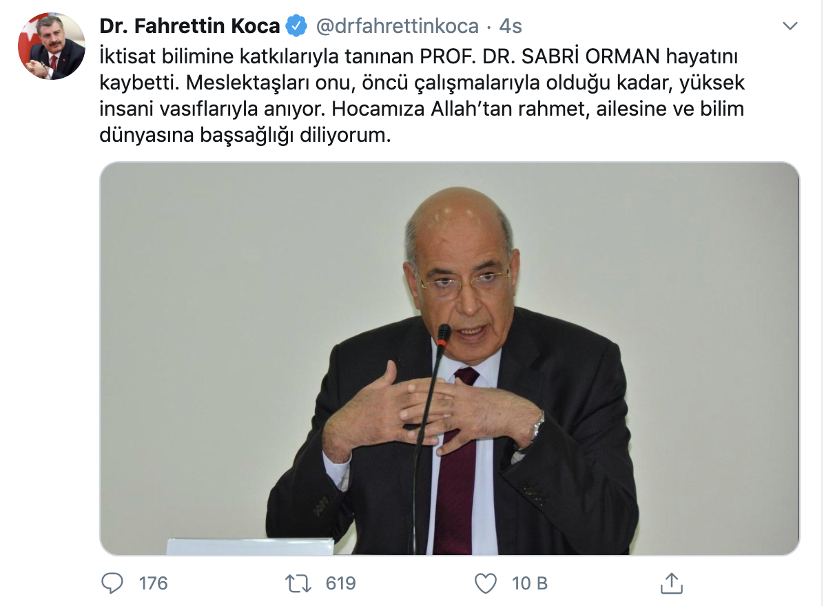 Sağlık Bakanı Fahrettin Koca, resmî Twitter hesabı üzerinden Prof. Dr. Sabri Orman için baş sağlığı mesajı yayınladı. Koca, Orman’ın meslektaşlarının onu, öncü çalışmalarıyla olduğu kadar, yüksek insani vasıflarıyla andığını kaydederek, ‘Hocamıza Allah’tan rahmet, ailesine ve bilim dünyasına başsağlığı diliyorum.’’ ifadelerini kullandı.