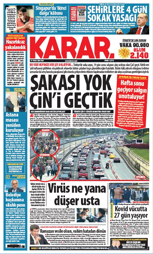 Sağlık Bakanı Fahrettin Koca, sosyal medya hesabından Kovid-19 salgınıyla ilgili son verileri paylaştı. Önceki gün 123 kişi virüs nedeniyle hayatını kaybederken, 4 bin 674 yeni vaka tespit edildi. Böylece toplam vaka sayısı 90 bin 980’a toplam can kaybıysa 2 bin 140’a yükseldi. Yoğun bakımda tedavi gören hasta sayısı bir önceki güne göre azalarak bin 909 oldu. Solunum cihazına bağlı hasta sayısıysa bin 33 olarak kayda geçti. İyileşen hasta sayısı ise 13 bin 430’a ulaştı. Türkiye, son açıklanan verilere göre vaka sayısına göre hastalığın çıkış noktası olarak görülen Çin’i geçti. Salgın hastalığı dünya kamuoyuna geç duyurmakla suçlanan Pekin yönetiminin açıkladığı veriler her ne kadar tartışmalı olsa da Çin önceki günkü duyurusunda ülkede vaka sayısını 83 bin 805, yaşamını yitirenlerin sayısını da 4 bin 636 olarak ilan etti. Eleştirilerin ardından Pekin yönetimi Vuhan’da Kovid-19 kaynaklı ölüm sayısını yüzde 50 artırmıştı.