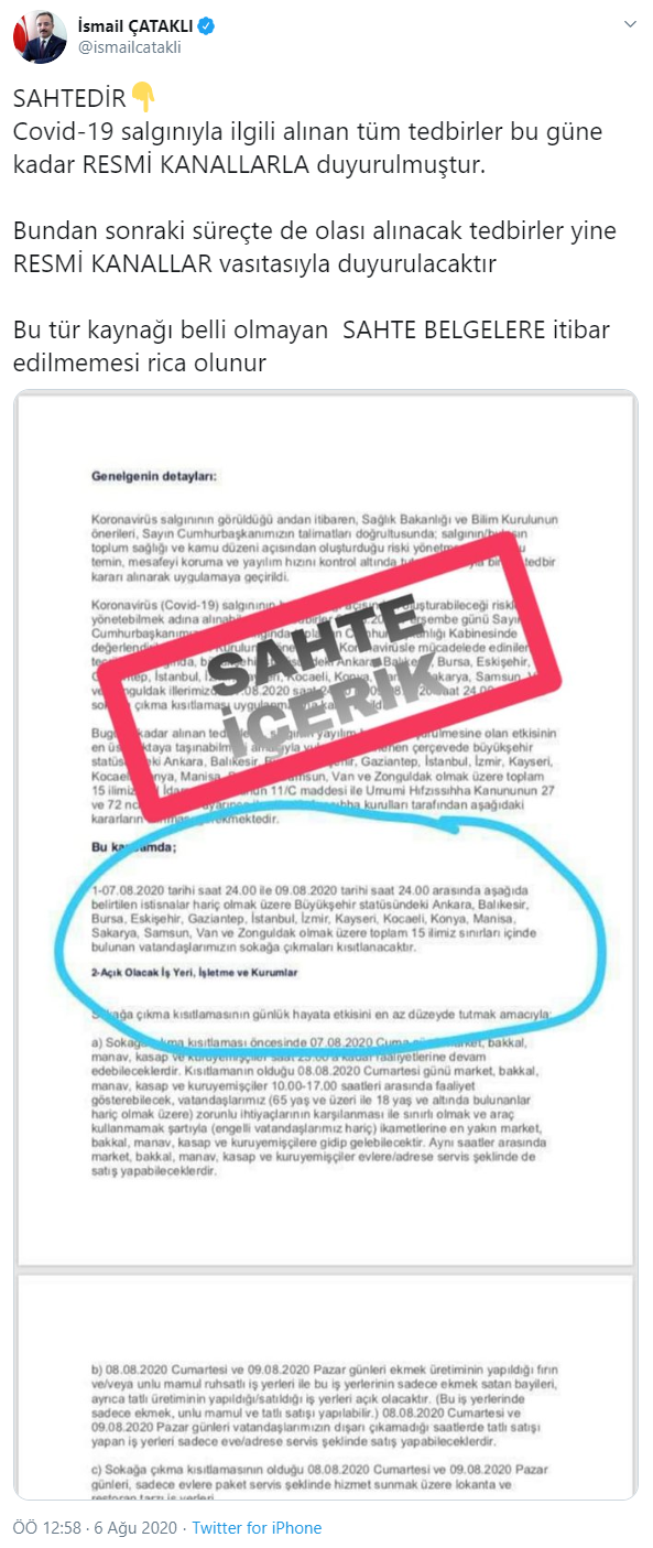 Konuyla ilgili sosyal medya hesabından açıklama yapan Çataklı, sokağa çıkma yasağı olacağı yönünde yayımlanan ve sosyal medyada dolaşan belgenin de sahte olduğunu belirtti.