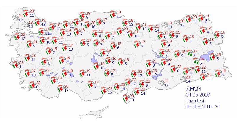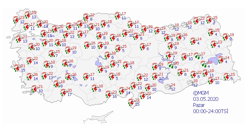 Meteoroloji'ye göre yurt genelinde 1-2-3-4-5 Mayıs 2020 günlerinde beklenen hava durumu şu şekilde: