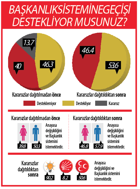 Kararsızlar dağıtıldıktan sonra Anayasa değişikliğini ve Cumhurbaşkanlığı sistemini isteyenlerin oranı yüzde 53,6, istemeyenlerin oranı ise yüzde 46,4 oldu.