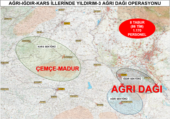 İçişleri Bakanlığından yapılan açıklamada, terör örgütü PKK'yı tamamen ülke gündeminden çıkarmak ve bölgede barındığı değerlendirilen teröristleri etkisiz hale getirmek maksadıyla, Ağrı, Iğdır, Kars illerinde Yıldırım-3 Ağrı Dağı Operasyonu başlatıldığı belirtildi.