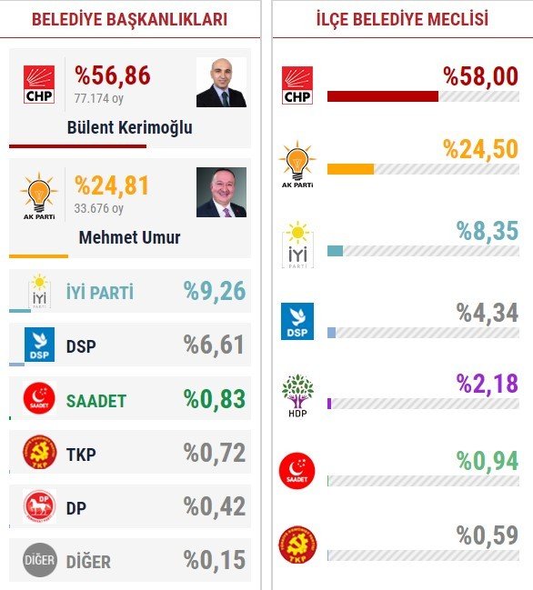 Bakırköy belediye meclis seçimlerinde ise CHP, 76 bin 689, AK Parti 33 bin 243, İYİ Parti 11 bin 328, DSP 5 bin 882, HDP 2 bin 952, Saadet Partisi bin 276, TKP 798, BBP 514, DP 461, Vatan Partisi 325 ve BTP 212 oy almıştı.