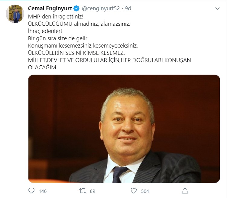 "21 Temmuz 2020 tarihinde Milliyetçi Hareket Partisi üyeliğinden kesin çıkarma talebi ile tedbirli olarak disiplin kuruluna sevk edilen Ordu İli Altınordu ilçesi üyesi ve Ordu Milletvekili Cemal Enginyurt hakkında, Milliyetçi Hareket Partisi Merkez Disiplin Kurulu'nun 30 Temmuz 2020 tarihinde yaptığı toplantı sonucu alınan karar ile Milliyetçi Hareket Partisi Tüzüğü'nün 78'inci maddesinin 'kesin çıkarma cezasını gerektiren haller başlıklı' 4. bendinin (c), (e) ve (i) fıkrası hükümleri uyarınca parti üyeliğinden kesin olarak çıkarılmasına karar verilmiştir."