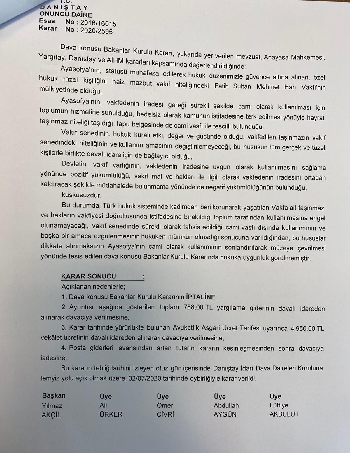 Bu durumda, Türk hukuk sisteminde kadimden beri korunarak yaşatılan Vakfa ait taşınmaz ve hakların vakfiyesi doğrultusunda istifadesine bırakıldığı toplum tarafından kullanılmasına engel olunamayacağı, vakıf senedinde sürekli olarak tahsis edildiği cami vasfı dışında kullanımının ve başka bir amaca özgülenmesinin hukuken mümkün olmadığı sonucuna varıldığından, bu hususlar dikkate alınmaksızın Ayasofya'nın cami olarak kullanımının sonlandırılarak müzeye çevrilmesi yönünde tesis edilen dava konusu Bakanlar Kurulu Kararında hukuka uygunluk görülmemiştir."