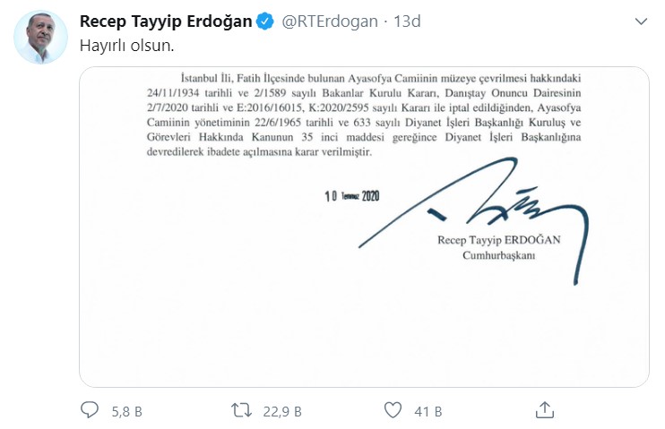 Cumhurbaşkanı Erdoğan, Ayasofya'nın Diyanet İşleri Başkanlığı'na devredilerek ibadete açılmasına yönelik Cumhurbaşkanlığı kararını 'hayırlı olsun' mesajıyla paylaştı.