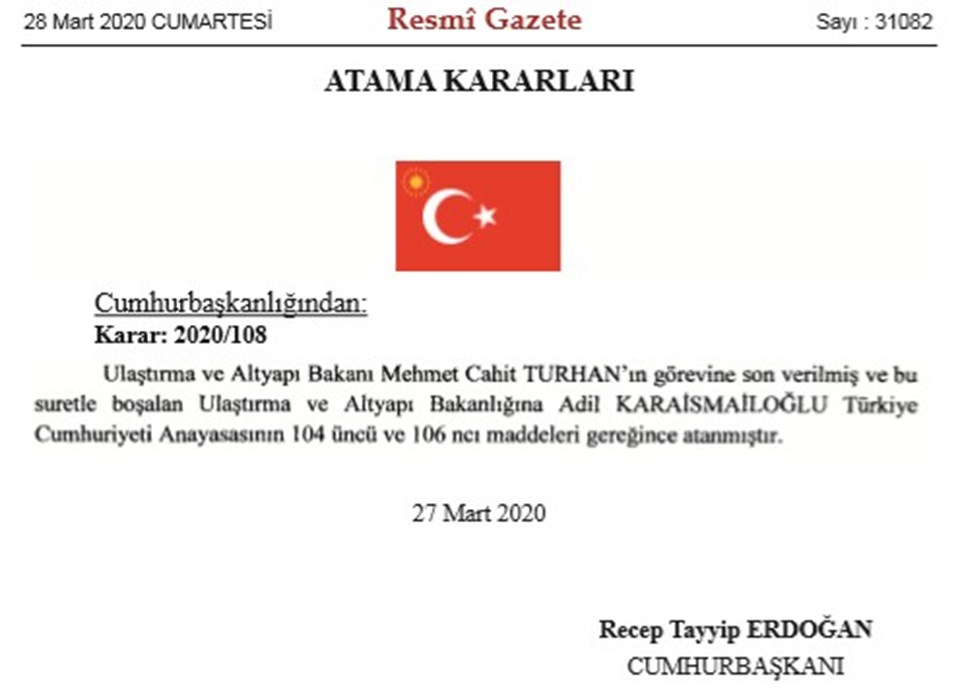 Ulaştırma ve Altyapı Bakanı Mehmet Cahit Turhan’ın görevine son verildi. Resmi Gazete’de yayımlanan “atama kararı”na göre Mehmet Cahit Turhan’ın yerine Ulaştırma ve Altyapı Bakanlığı’na Adil Karaismailoğlu getirildi.
