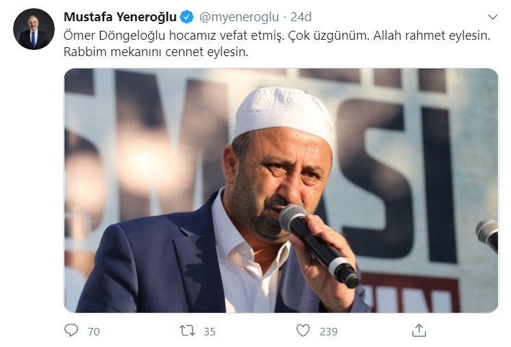 DEVA Partisi İstanbul Milletvekili Mustafa Yeneroğlu da "Ömer Döngeloğlu hocamız vefat etmiş. Çok üzgünüm. Allah rahmet eylesin. Rabbim mekanını cennet eylesin" paylaşımı yaptı.