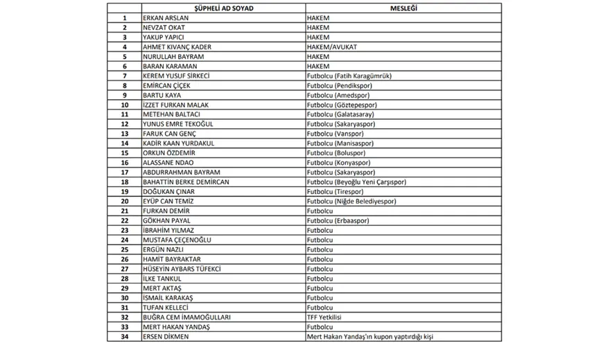 Soruşturma dosyasına giren 34 kişilik şüpheli listesi, iddia edilen yasa dışı faaliyetlerin yalnızca birkaç kulüple sınırlı kalmadığını; Süper Lig'den alt liglere, hakem camiasından federasyon kurullarına kadar geniş bir yelpazeye yayıldığını gözler önüne seriyor.