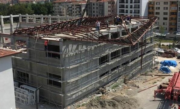 Olay, sabah saatlerinde İsmailbey Mahallesinde bulunan Mustafa Kaya Anadolu Lisesi'ne ait inşaat halindeki spor salonunda meydana geldi. Kaba inşaatı tamamlanan 3 katlı spor salonunun çatı paltformunun montajı için çalışma başlatıldı. Tonlarca ağırlığındaki çelik platform, vinçle binaya çıkarıldı. Platformun, vinç yardımıyla çatıya montajı sırasında halat koptu.