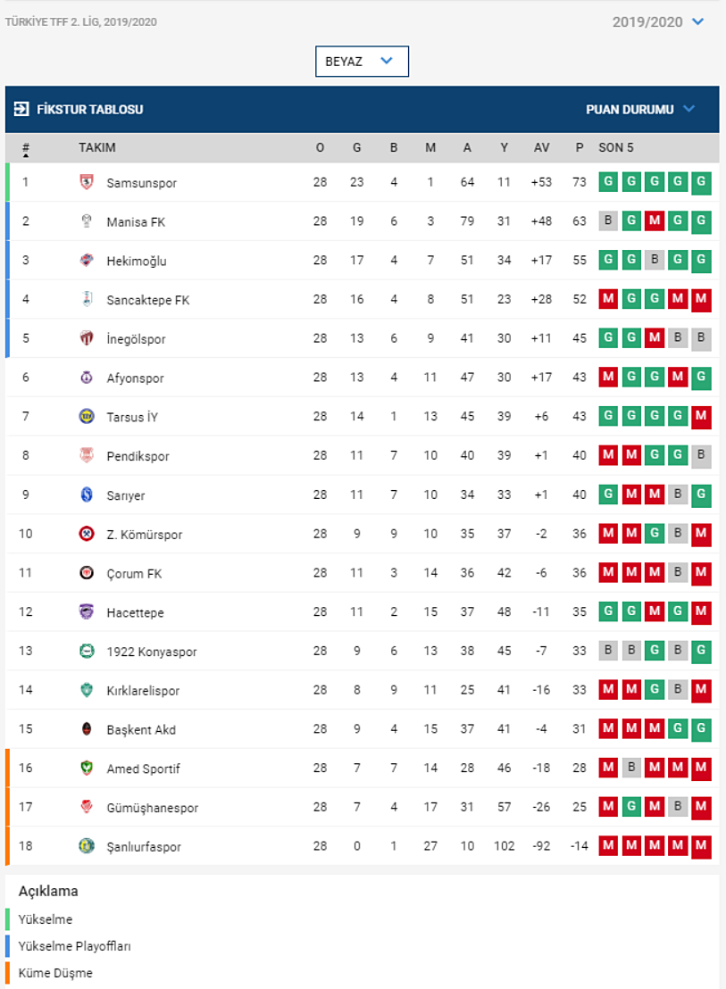 2. LİG BEYAZ GRUP 2019-20 SEZONU PUAN DURUMU