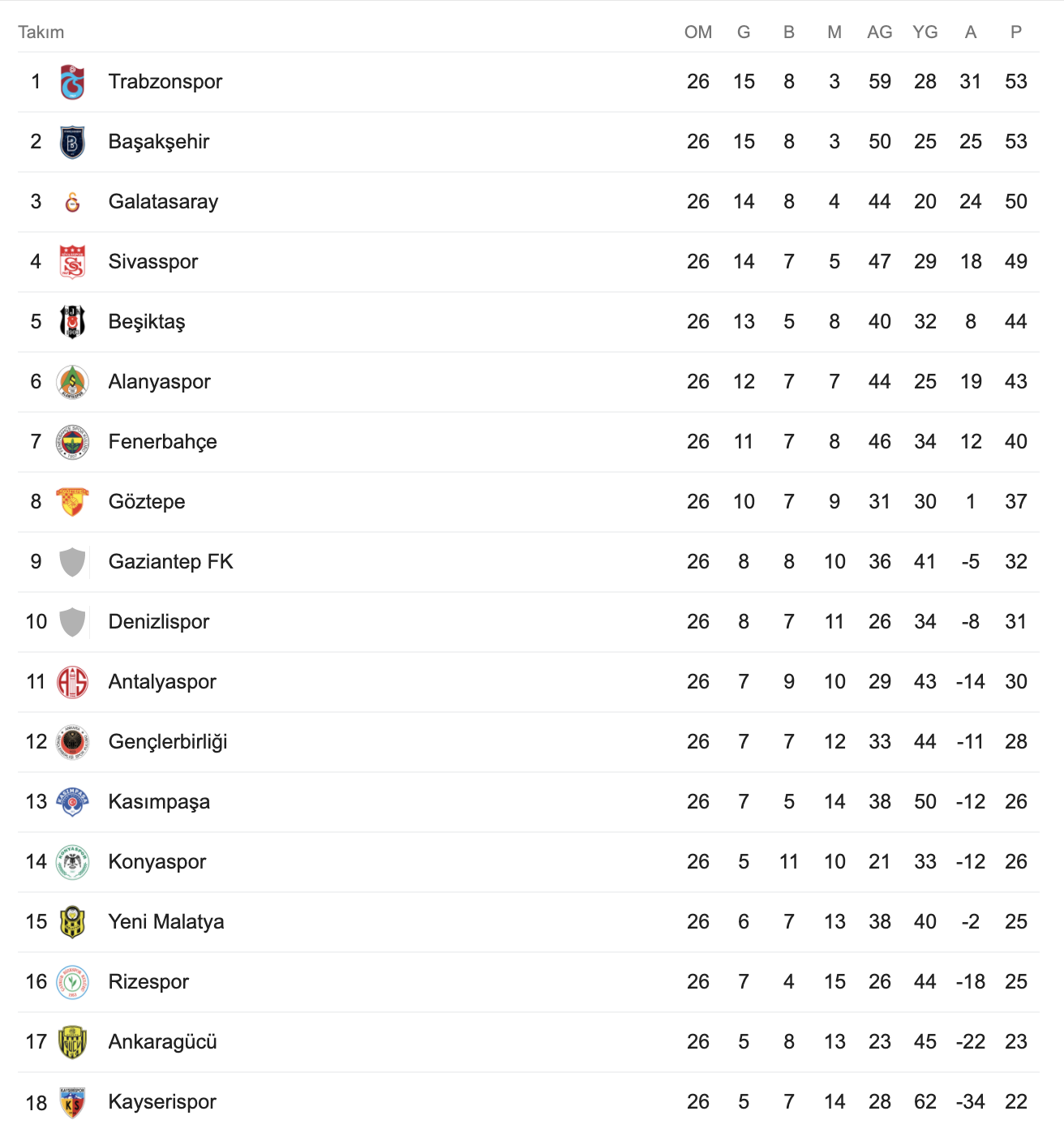 37 puandaki Göztepe 8'nci, 32 puandaki Gaziantep ise 9'ncu sırada yer alıyor. Ligin 10'ncu sırasındaki Denizlispor 31, 11'nci sıradaki Antalyaspor'un 30, 12'nci sıradaki Gençlerbirliği'nin ise 28 puanı var. 26 puandaki iki takımdan Kasımpaşa 13'ncü ve Konyaspor ise 14'ncü sırada bulunuyor.