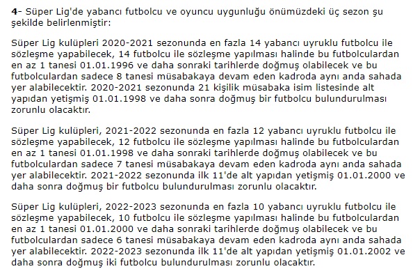 Türkiye Futbol Federasyonu (TFF) ile Kulüpler Birliği'nin, federasyonun İstanbul Riva'daki tesislerinde gerçekleştirdiği toplantıda, yabancı futbolcu sınırının düşürülmesi konusu ele alındı. 2020-21 sezonundan itibaren yabancı kuralı değişecek ve önümüdeki sezon da 14 olan kontenjan sonraki sezonlarda kademeli olarak düşürülecek.