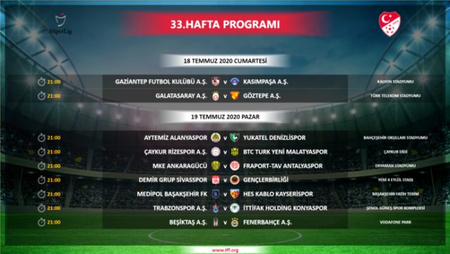 TFF, Süper Lig'de 33. hafta programında değişikliğe gitti. Yapılan değişiklikler sonrasında Gaziantep FK - Kasımpaşa ve Galatasaray - Göztepe maçları 18 Temmuz Cumartesi günü 21.00'de oynanacak. Kalan maç ise 19 Temmuz Pazar günü 21.00'de başlayacak. 2 maç cumartesi günü, 7 maç pazar günü oynanacak.